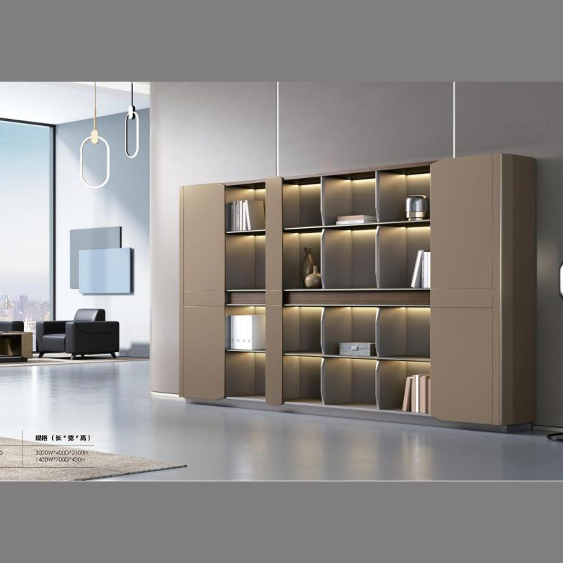 Дизайнът на крака включва голяма извита повърхност с две-тонално наслояване. Основата се свързва безпроблемно с горната част на дългия допълнителен шкаф чрез маса-долен поддържащ панел, което води до гладки, непрекъснати линии и подчертано модерна естетика, която подобрява модерните бизнес пространства.